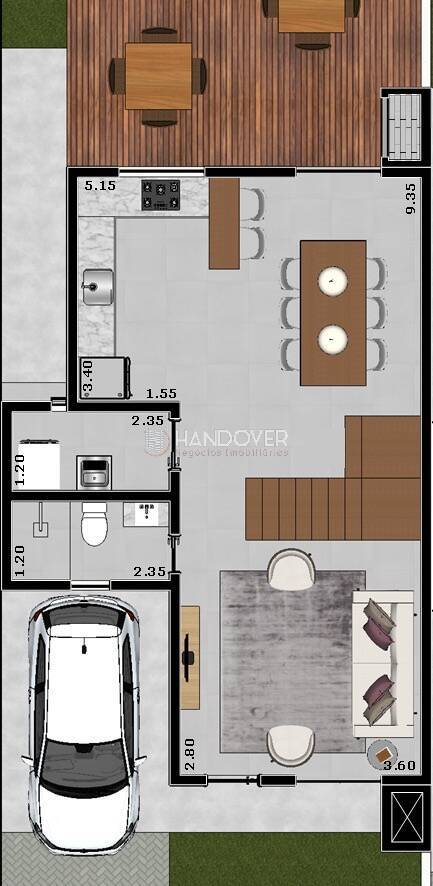 Sobado com sala, cozinha e sala de jantar integradas, lavanderia e lavabo, pátio externo nos fundos com churrasqueira, vaga de garagem coberta e 3 vagas descobertas no térreo.