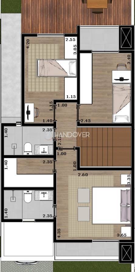 Segundo andar com 3 dormitórios sendo uma suíte com closet e sacada, mais 2 quartos em banheiro social.