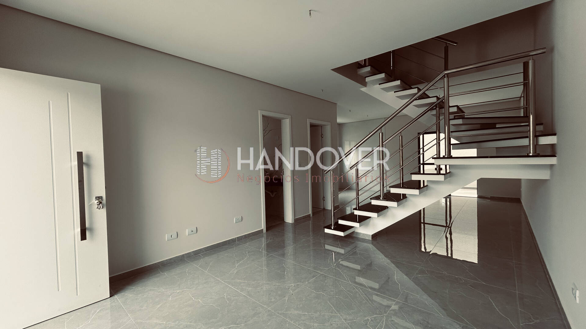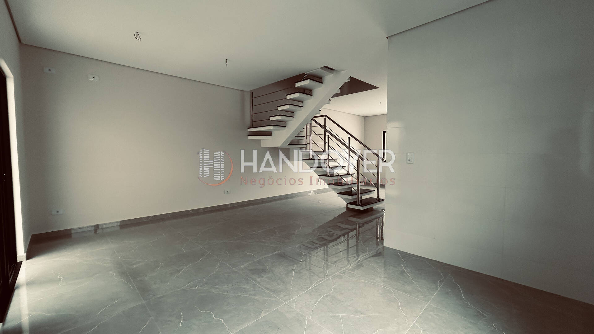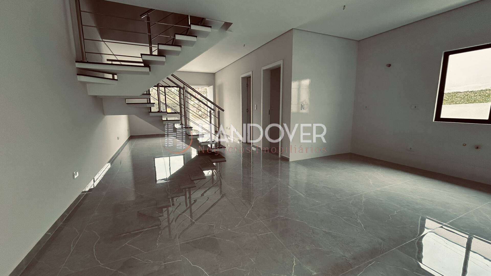 Térreo com porcelanato, inclusive no lavabo e escadas em granito preto e corrimão em inox. Piso superior em laminado de madeira.